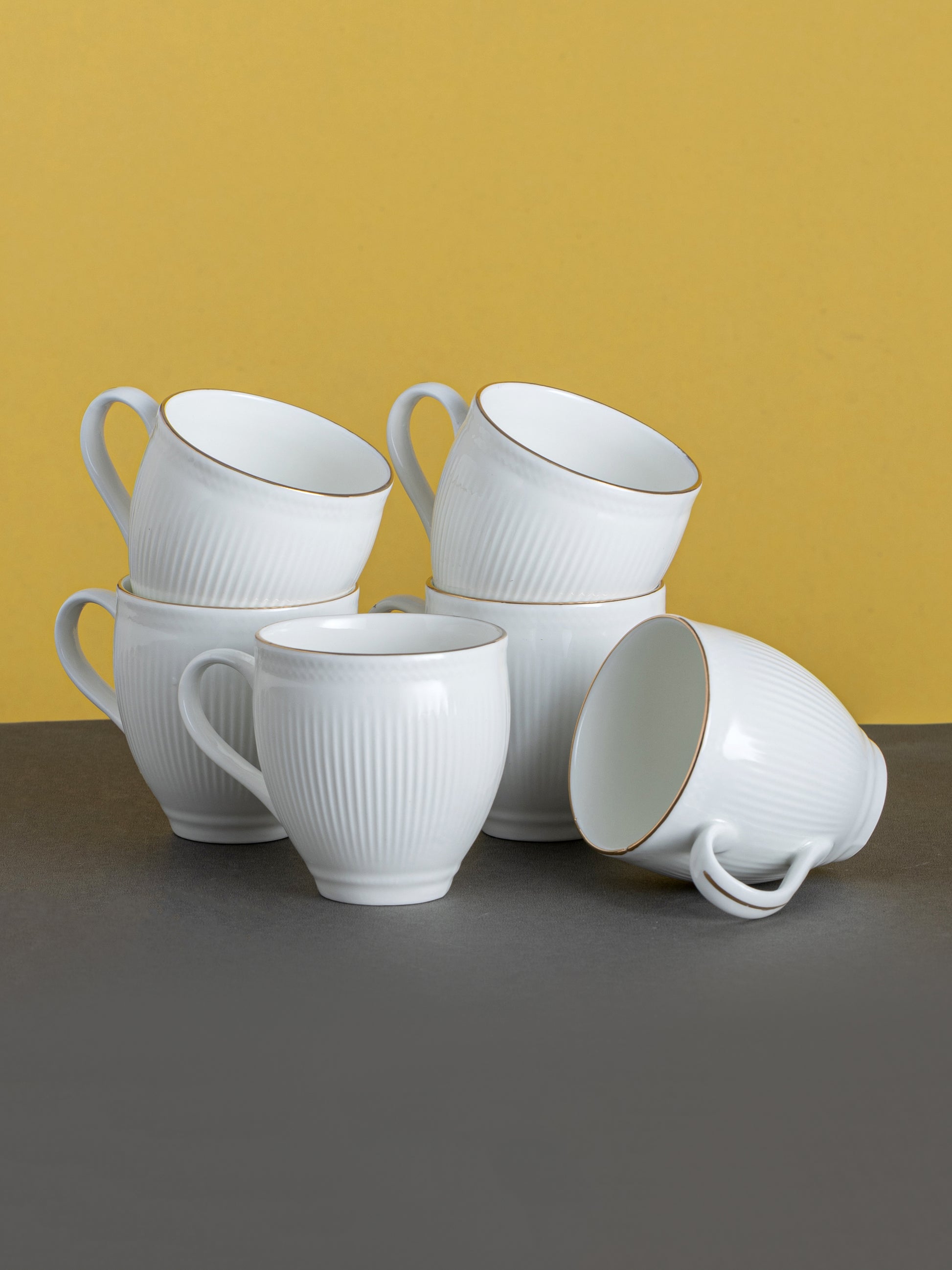 Elevate your serving with the exquisite Onyx Impression Mug Set. This elegant collection includes six durable ceramic mugs, featuring a crisp White finish accented by a delicate gold rim, bringing a touch of luxury to your coffee and tea moments.
