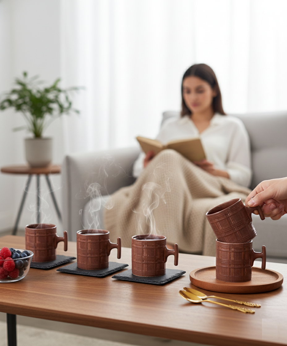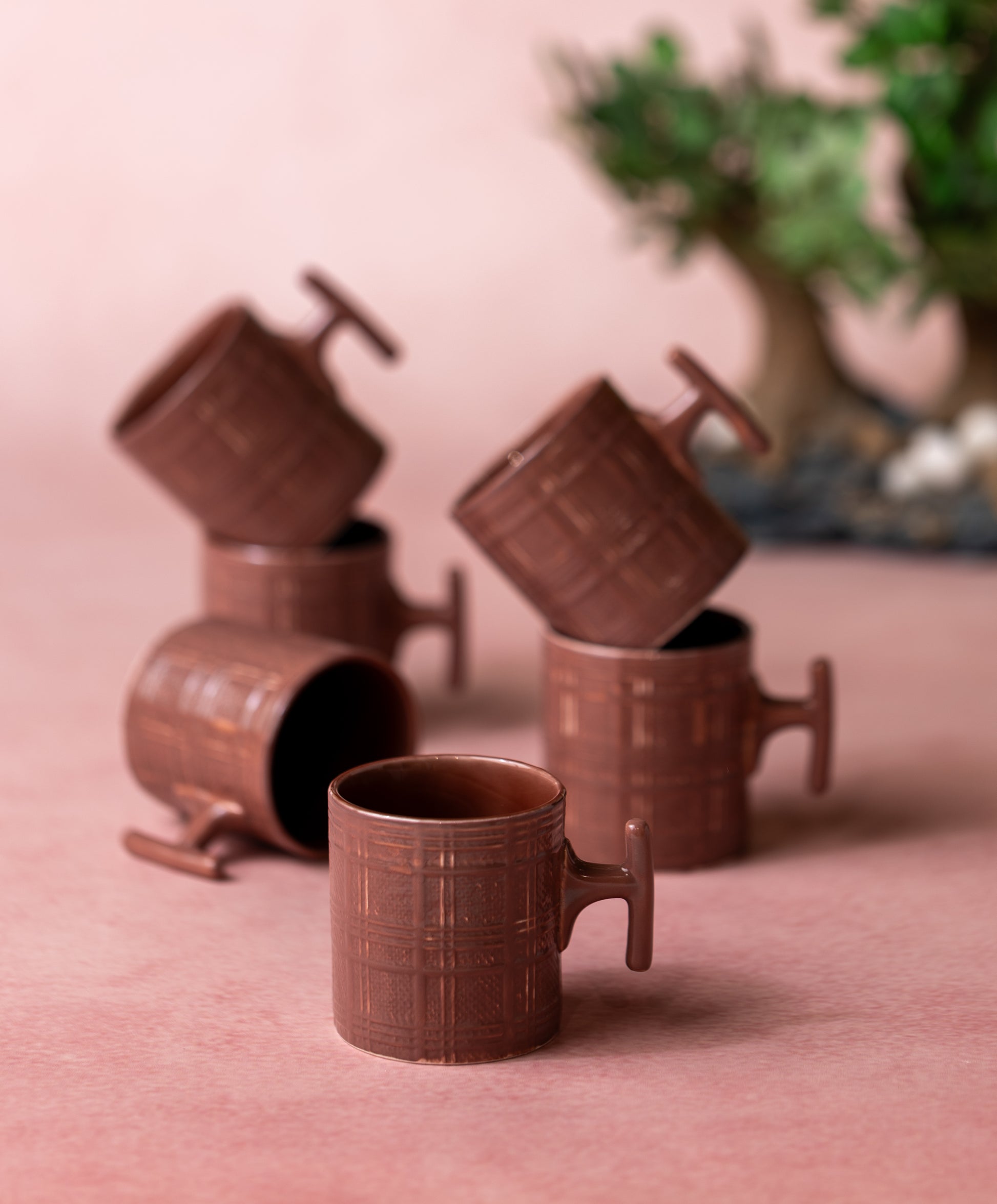 Elevate your serving style with the striking JCPL Grid Checkmate Mug Set. This collection of six durable Porcelain mugs features a modern, playful Plum-colored grid Check mate pattern, bringing a burst of sophisticated color to your daily routines and entertaining.