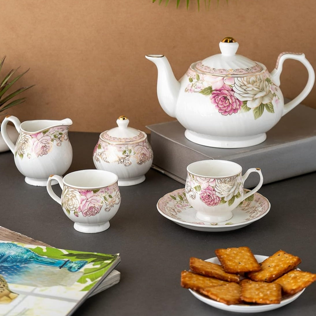 Karina Rose Gold Print Premium Fine Ceramic Tea Set of 15 Pcs (1 Kettle + 6 Cups + 6 Saucers + 1 Milk Pot + 1 Sugar Pot)